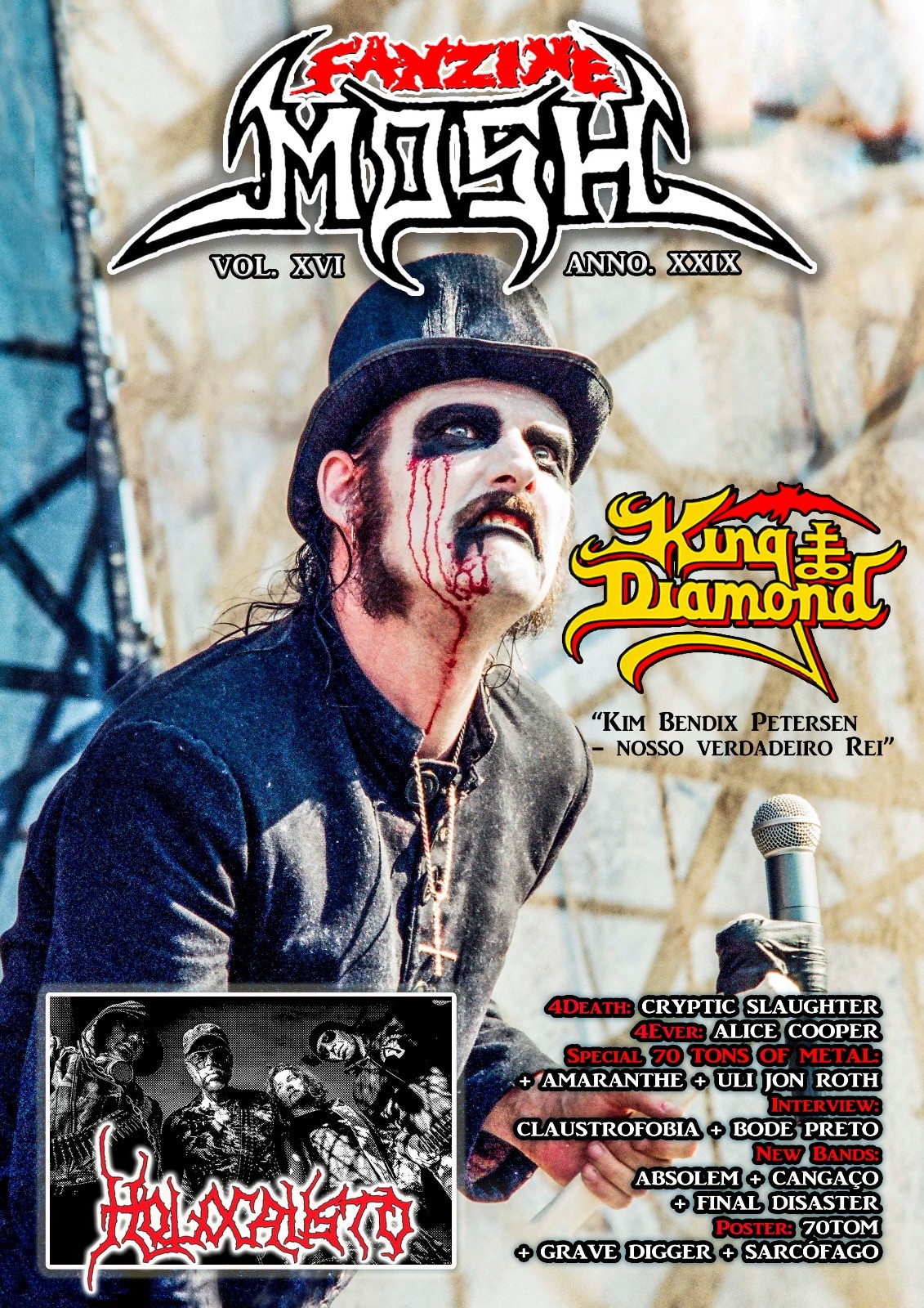 Mas vamos falar desta relíquia. O grande destaque e capa desta edição esta na entrevista E-X-C-L-U-S-I-V-A com King Diamond com fotos ainda mais únicas nunca vistas em nenhum outro lugar. Uma entrevista primorosa que juntou a imagens maravilhosas, completando-se uma a outra. Ao lado do “Nosso Rei”, temos os mineiros do Holocausto que estão retornando a cena com um novo e fulminante álbum que eles falam em detalhes na entrevista que vocês poderão ler nas páginas a frente.